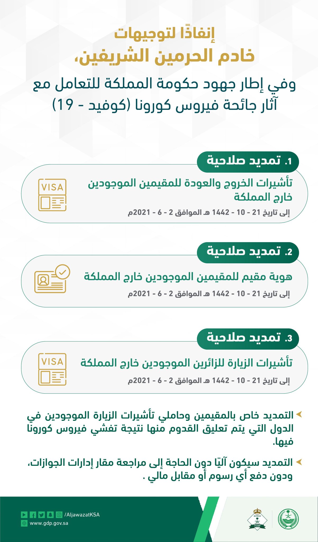 أخبار السعودية هام On Twitter عاجل إنفاذ ا لتوجيهات خادم الحرمين الشريفين تمديد صلاحية الإقامة وتأشيرة الخروج والعودة وتأشيرات الزيارة آليا دون مقابل في الدول التي يتم تعليق القدوم منها Https T Co Gtmt6fkxjz